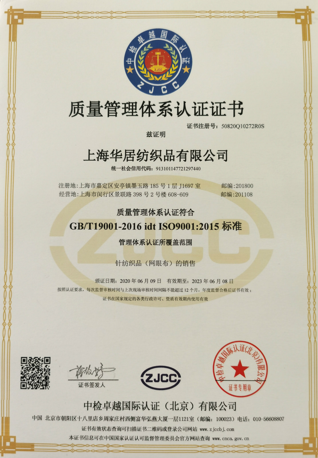 2020年6月9日,上海華居紡織品有限公司通過(guò)ISO質(zhì)量管理體系認(rèn)證